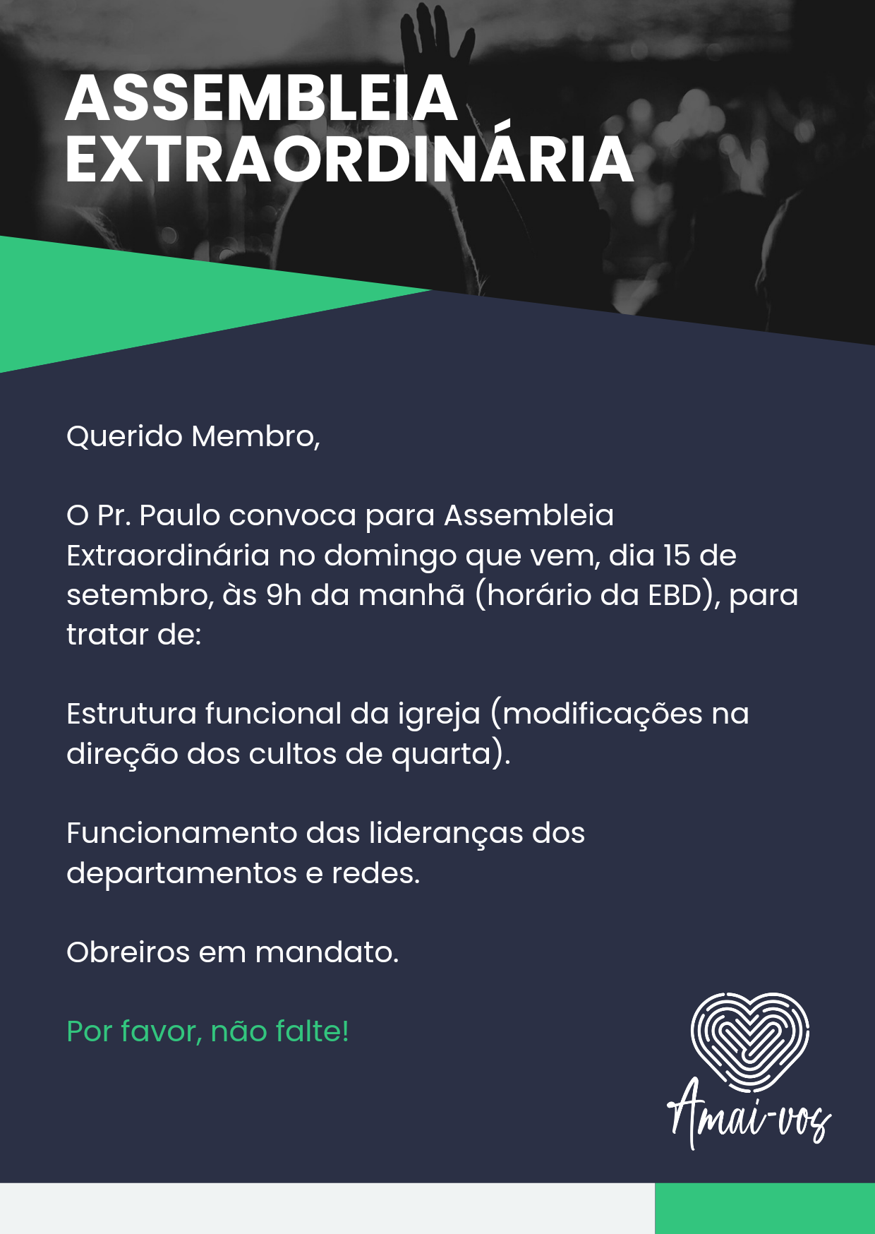 | 16 SEG 06h Consagração 20h SEPA: Seminário Pentecostal Amai-vos |