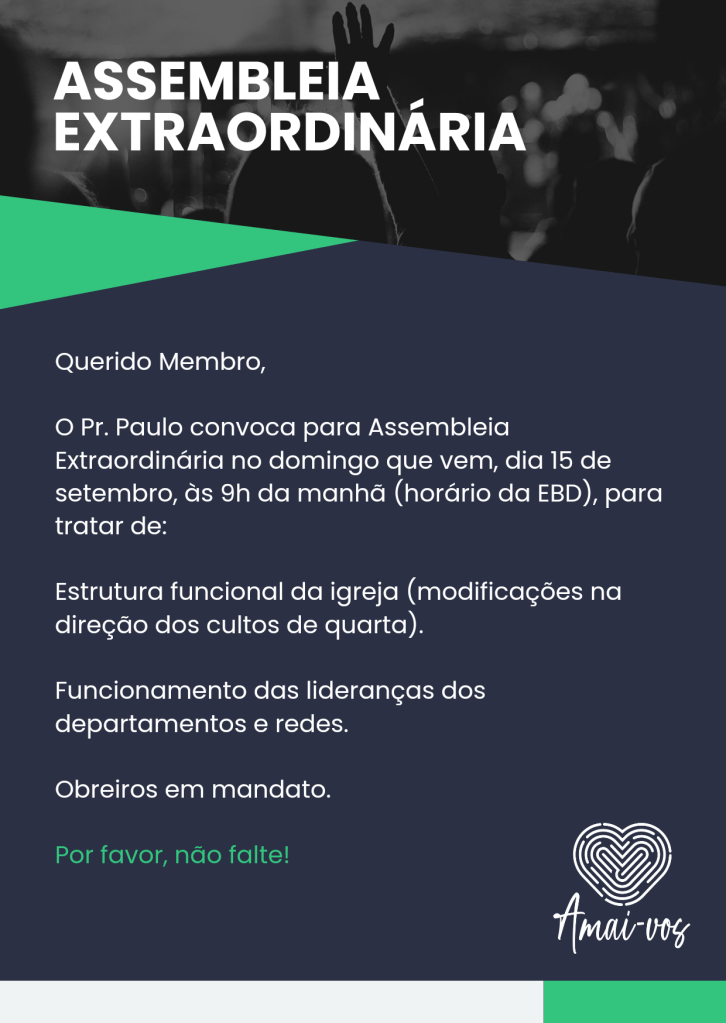 Dízimos e ofertas podem ser transferidos para a conta corrente no Banco PagSeguro – agência 0001 – c/c 04646591-0 (CNPJ: 01.075.135/0001-89 – MINISTÉRIO AMAI-VOS IGREJA CELULAR).