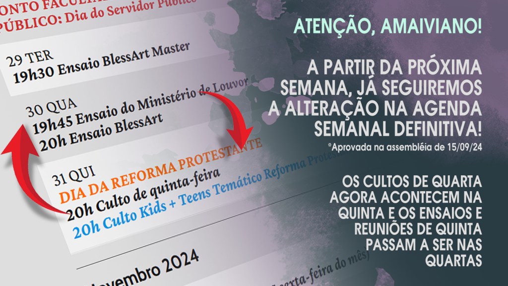 | 03 DOM 09h Escola Bíblica 19h Culto da Rede de Homens 19h Culto Temático Reforma Protestante |