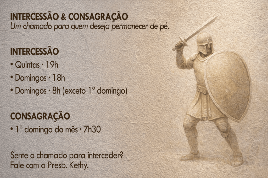 | 29/jan QUI 15h às 16h Projeto Gerações em Movimento 16h às 17h Projeto Gerações em Movimento 19h Momento de Intercessão 20h Culto (dirigido pela Rede de Crianças – 5ª quinta-feira) |