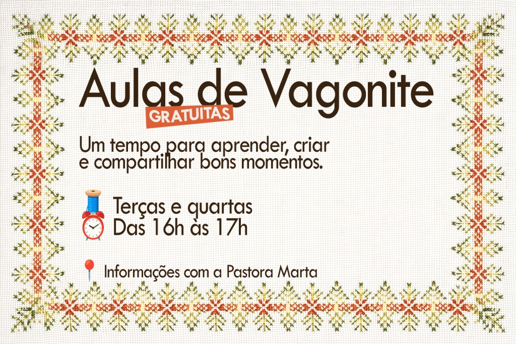 | 28/jan QUA 15h Projeto Gerações em Movimento 16h Projeto Gerações em Movimento 16h Aulas de Vagonite 19h Ensaio BlessArt Kids 19h Ensaio BlessArt Teens 20h Ensaio BlessArt 20h Ensaio Ministério de Louvor 20h Ensaio RevivArt |