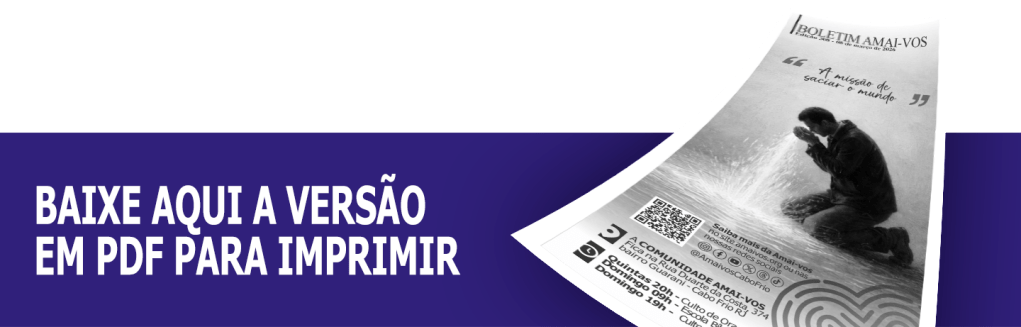 Amados, quando fazemos parte de uma comunidade como a nossa, precisamos entender claramente qual é a sua missão, visão e valores. Não caminhamos sem direção, precisamos saber para onde estamos indo. Jesus veio com uma missão muito clara: salvar o mundo. O Pai amou o mundo (o homem e toda a criação) e enviou o seu Filho. Essa missão custou a vida de Jesus. E para cumpri-la, Ele foi totalmente guiado pelo Espírito Santo. Se seguimos Jesus, precisamos continuar o que Ele começou. E isso só é possível quando somos também guiados pelo Espírito Santo. Então, qual é a missão da Comunidade Amai-vos? “Saciar o mundo com aquele que é a água da vida.”